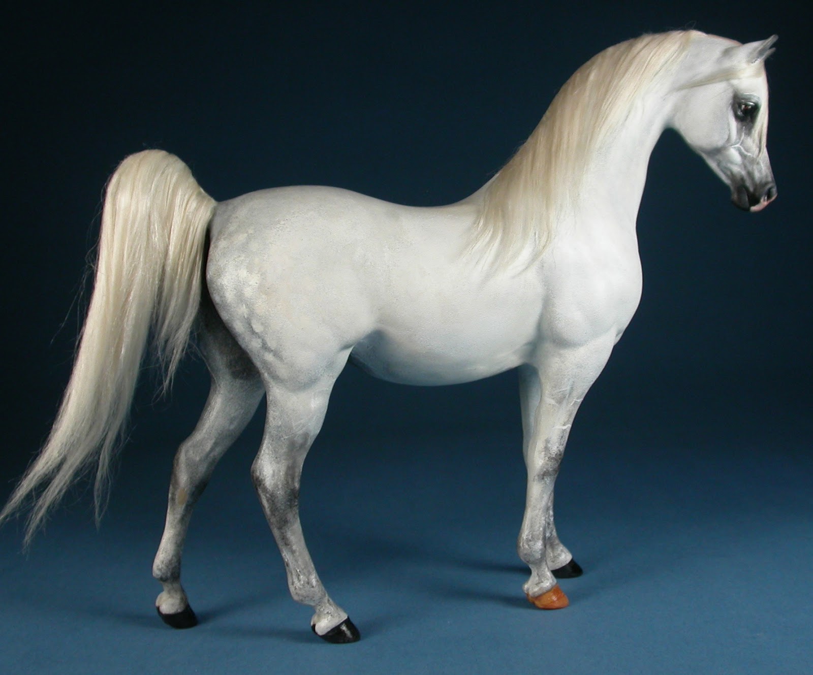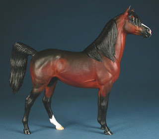 Elizabeth LaRose insightfully says, "I like the exuberance you see in them—the wild imaginative thoughts people had and the way these were worked out in the conversion of an existing factory-made sculpt into something completely different and totally outside that particular box. Sometimes that vision came at the expense of anatomical accuracy, because the materials or means were not available to pull that off, and yet people went there anyway, mitigating that problem with dramatic paint work, dazzling conformational attributes like an exquisitely re-carved head, expressively-haired manes and tails, a photograph with the model wistfully examining a distant, almost magical horizon. I get the same tingly feeling from seeing photos of the older horses now that I did when I was a little girl."